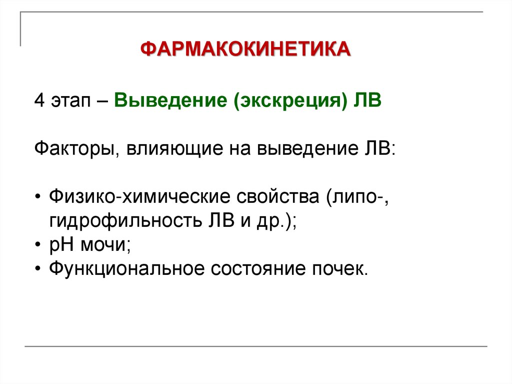 ФАРМАКОКИНЕТИКА4 этап – Выведение (экскреция) ЛВ