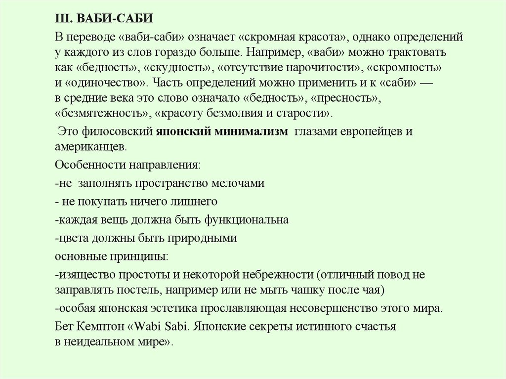 III. ВАБИ-САБИВ переводе «ваби-саби» означает «скромная красота», однако определений