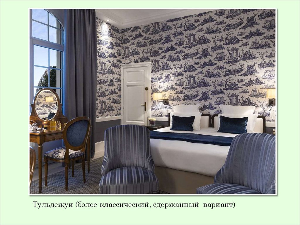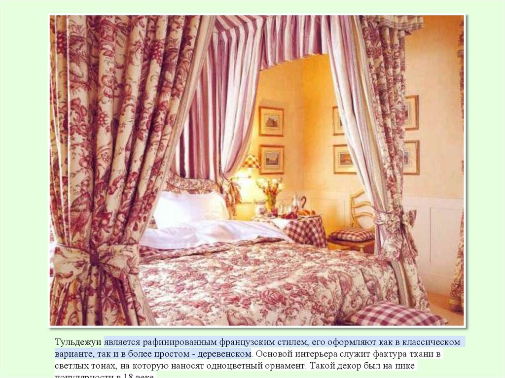 Тульдежуи является рафинированным французским стилем, его оформляют как в классическомварианте, так и в более простом - деревенском. Основой интерьера служит фактура ткани в