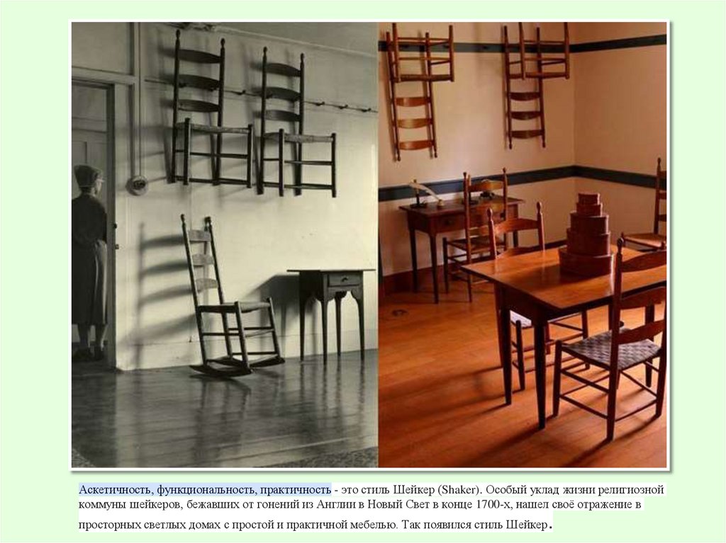 просторных светлых домах с простой и практичной мебелью. Так появился стиль Шейкер .