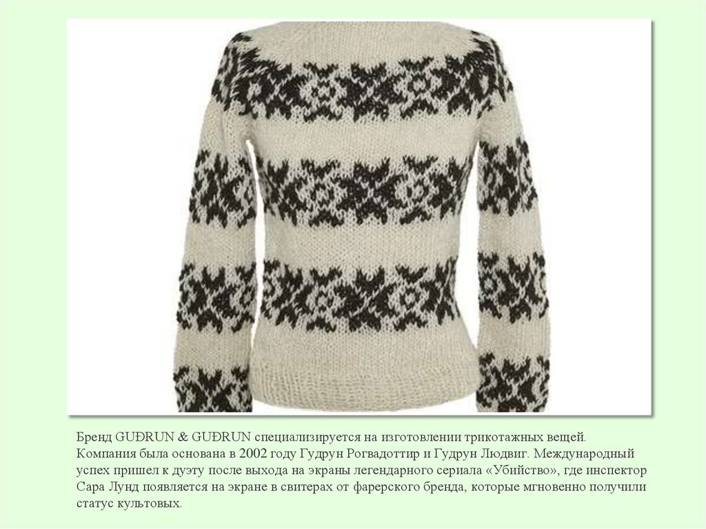 Бренд GUÐRUN & GUÐRUN специализируется на изготовлении трикотажных вещей.Компания была основана в 2002 году Гудрун Рогвадоттир и Гудрун Людвиг. Международный