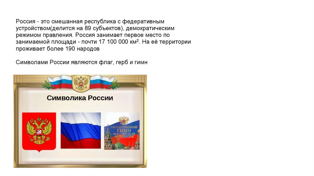 Россия - это смешанная республика с федеративнымустройством(делится на 89 субъектов), демократическим