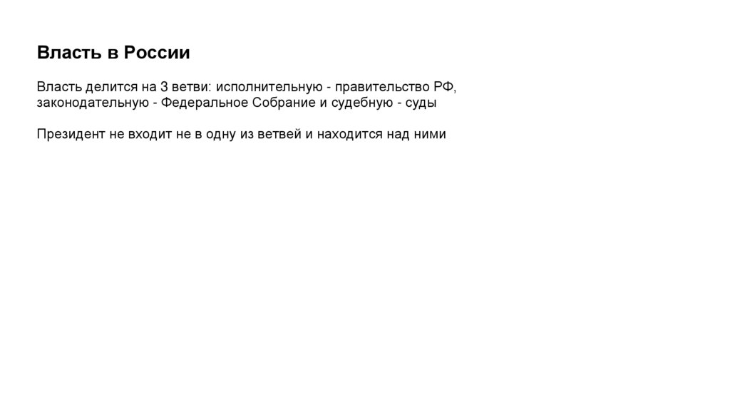 Власть в РоссииВласть делится на 3 ветви: исполнительную - правительство РФ,