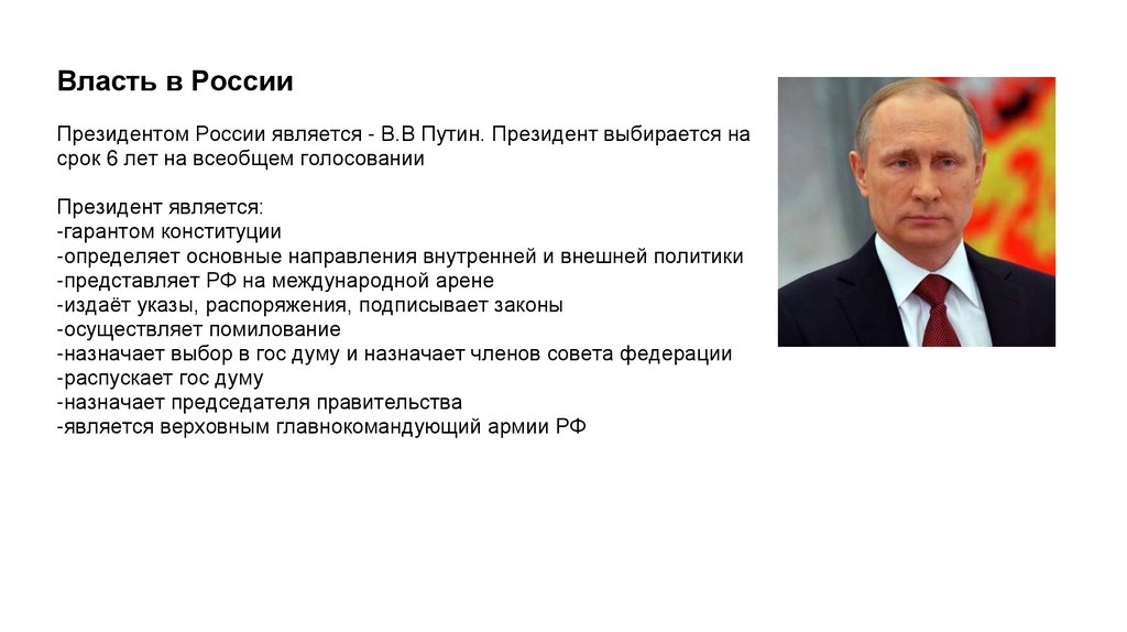 Власть в РоссииПрезидентом России является - В.В Путин. Президент выбирается на