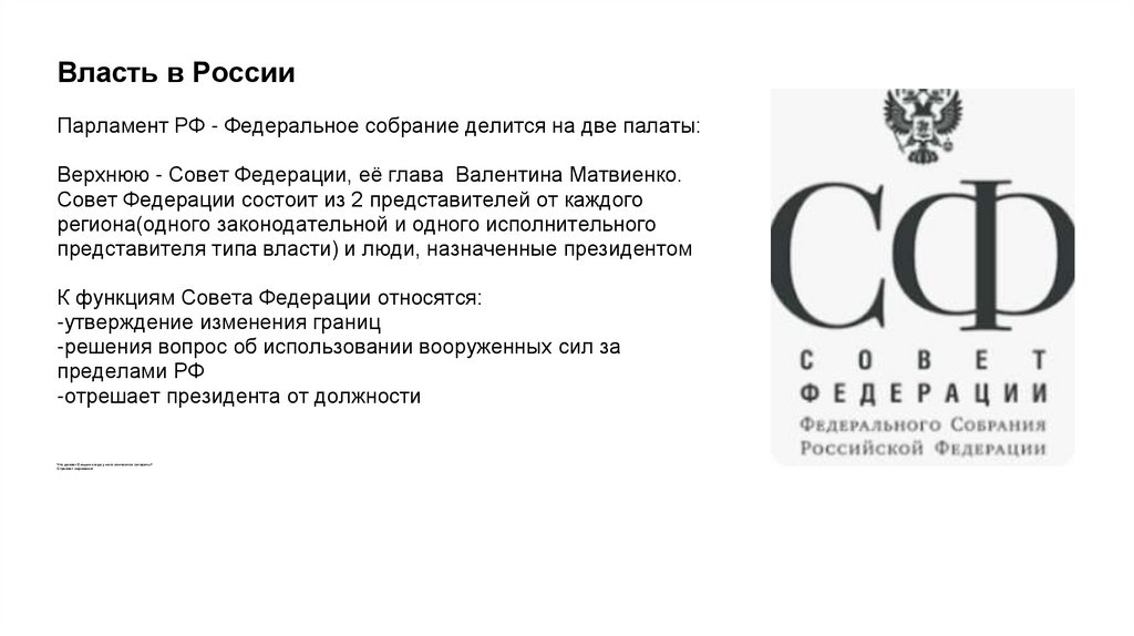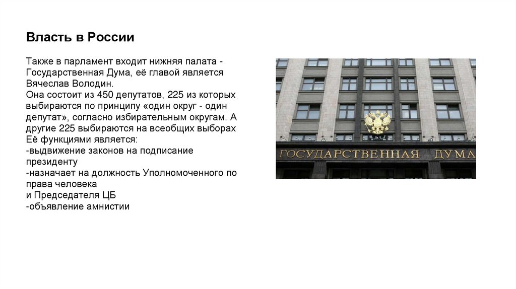 Власть в РоссииТакже в парламент входит нижняя палата Государственная Дума, её главой является