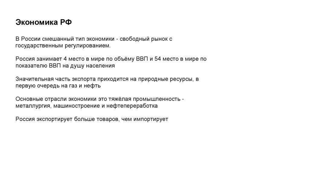 Экономика РФВ России смешанный тип экономики - свободный рынок с