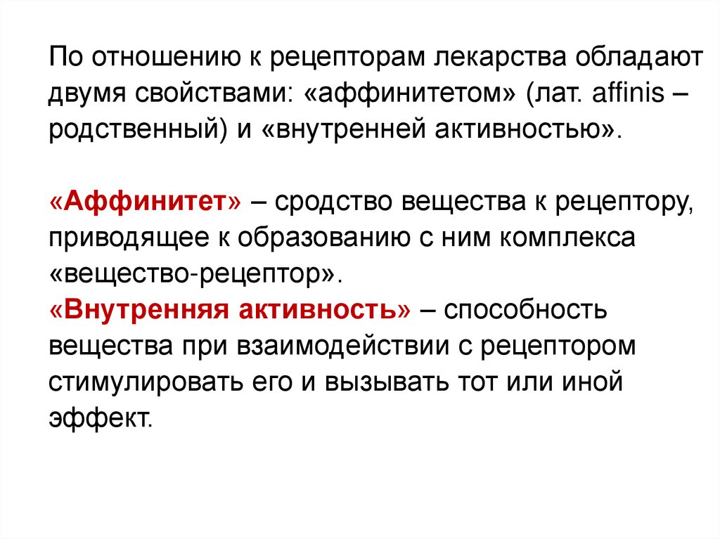 По отношению к рецепторам лекарства обладаютдвумя свойствами: «аффинитетом» (лат. affinis –