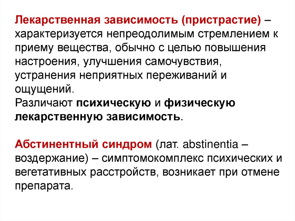 Лекарственная зависимость (пристрастие) –характеризуется непреодолимым стремлением к