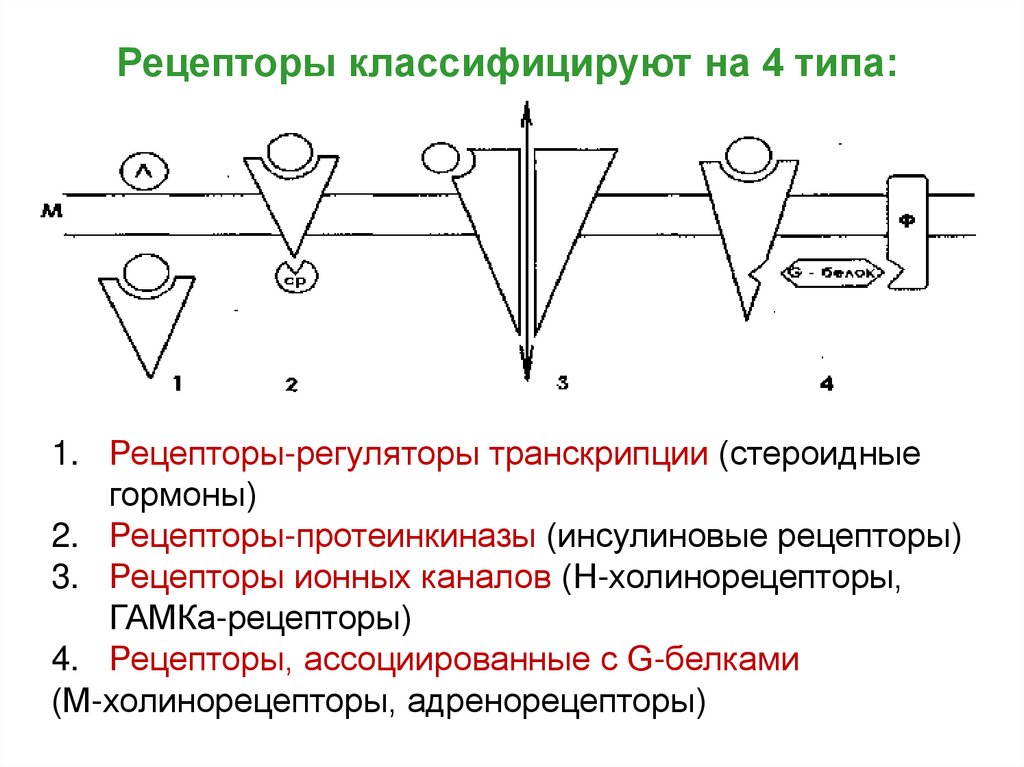 Рецепторы классифицируют на 4 типа:1. Рецепторы-регуляторы транскрипции (стероидные