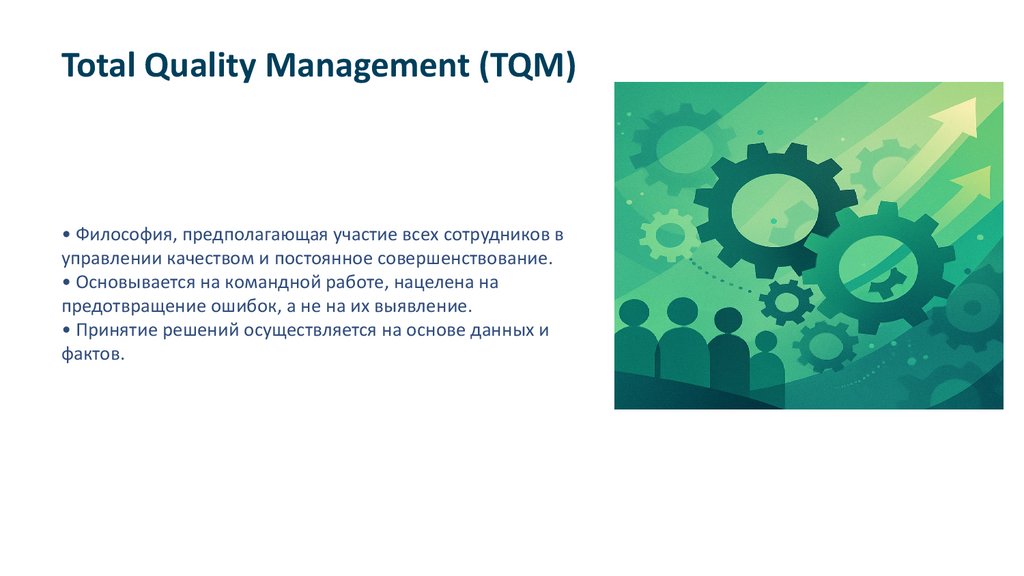 Total Quality Management (TQM)• Философия, предполагающая участие всех сотрудников в