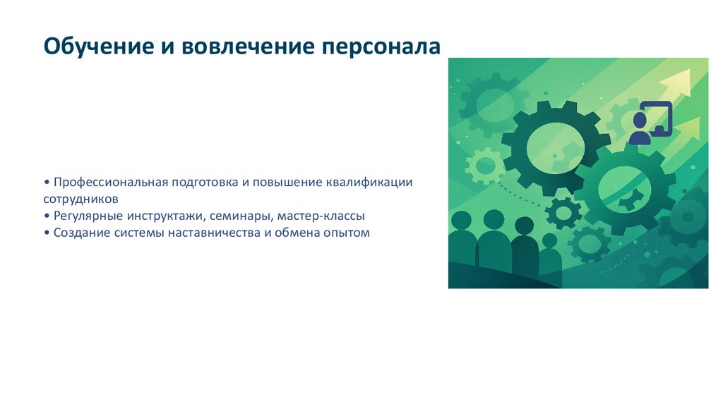 Обучение и вовлечение персонала• Профессиональная подготовка и повышение квалификации