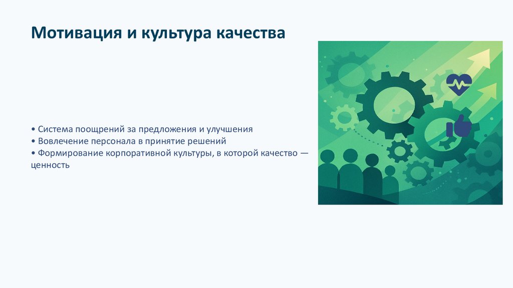 Мотивация и культура качества• Система поощрений за предложения и улучшения