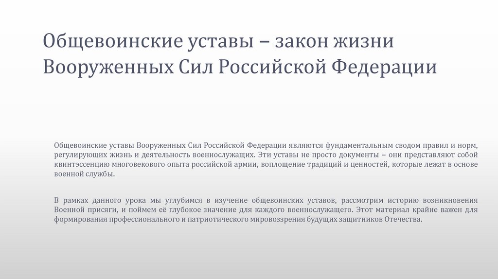 Общевоинские уставы Вооруженных Сил Российской Федерации являютсяфундаментальным сводом правил и норм, регулирующих жизнь и