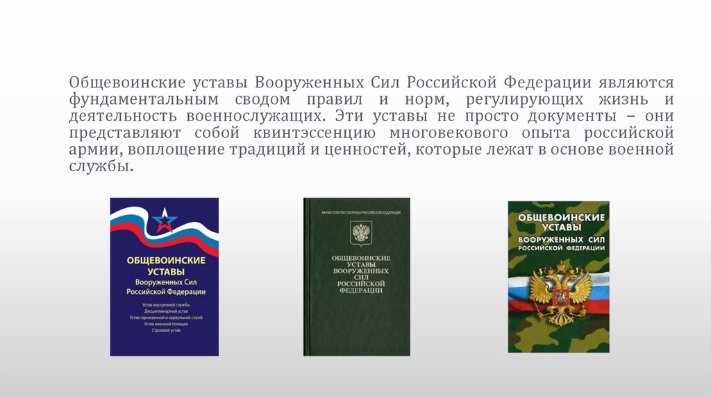 Общевоинские уставы Вооруженных Сил Российской Федерации являются фундаментальным сводом правил и норм,