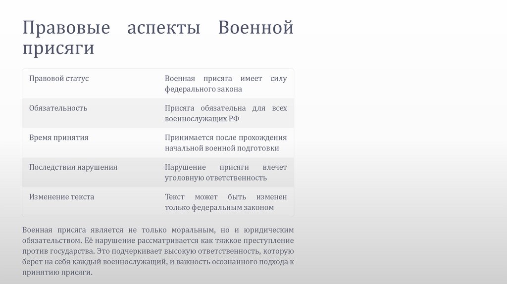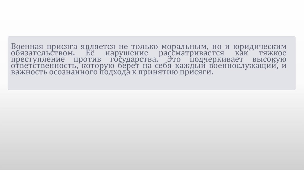 Военная присяга является не только моральным, но и юридическимобязательством. Её нарушение рассматривается как тяжкое