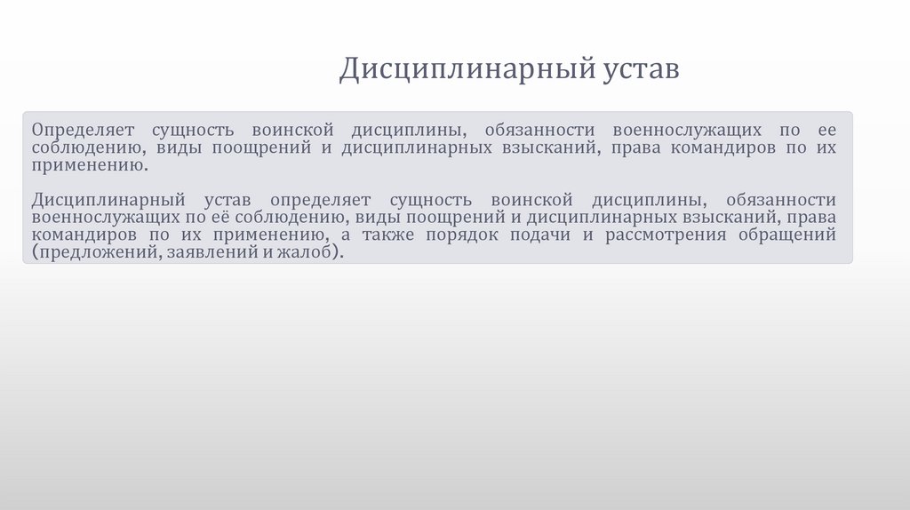 Дисциплинарный уставОпределяет сущность воинской дисциплины, обязанности военнослужащих по ее