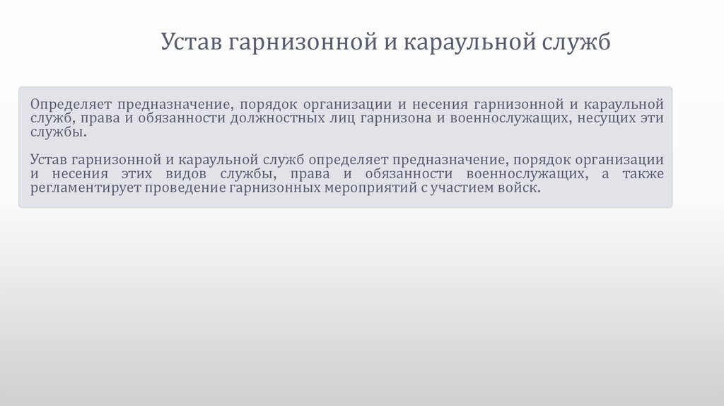 Устав гарнизонной и караульной службОпределяет предназначение, порядок организации и несения гарнизонной и караульной