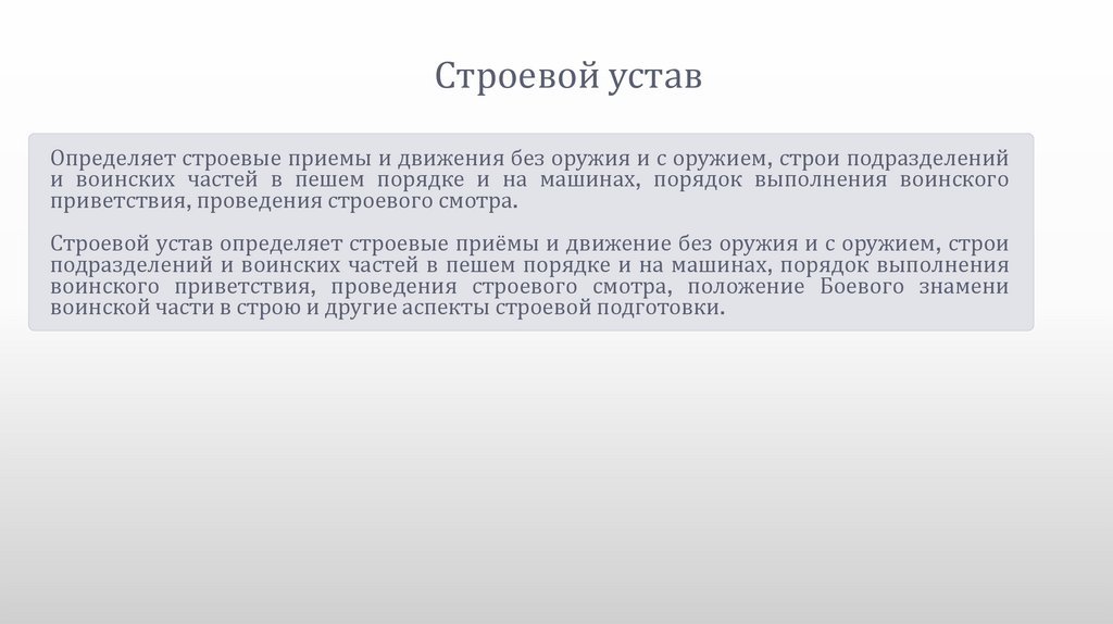 Строевой устав определяет строевые приёмы и движение без оружия и с оружием, строи