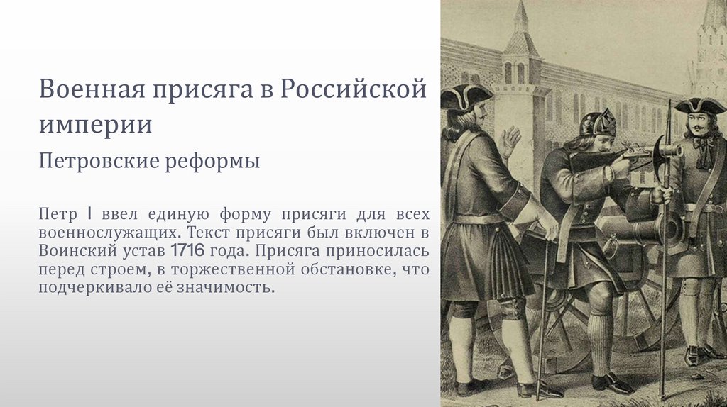 формализованный характер. Воины клялись в верности царю и Отечеству, что отражало новую