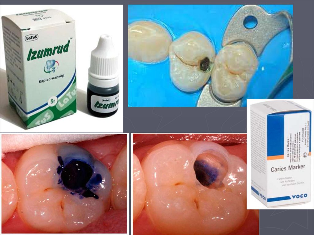 Маркеры кариесаС помощью кариес-маркеров на основе фуксина определяют границы