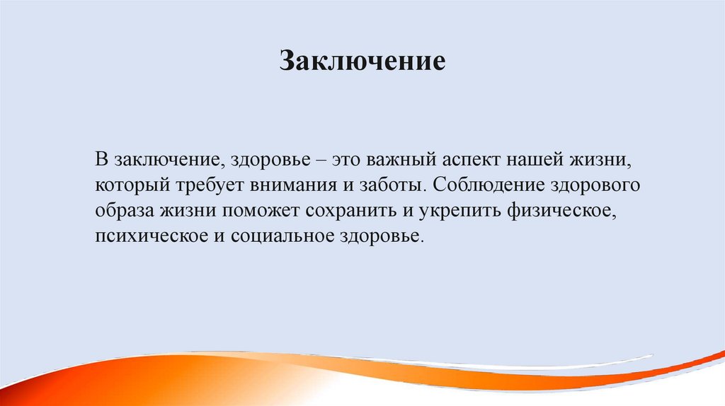 ЗаключениеВ заключение, здоровье – это важный аспект нашей жизни,