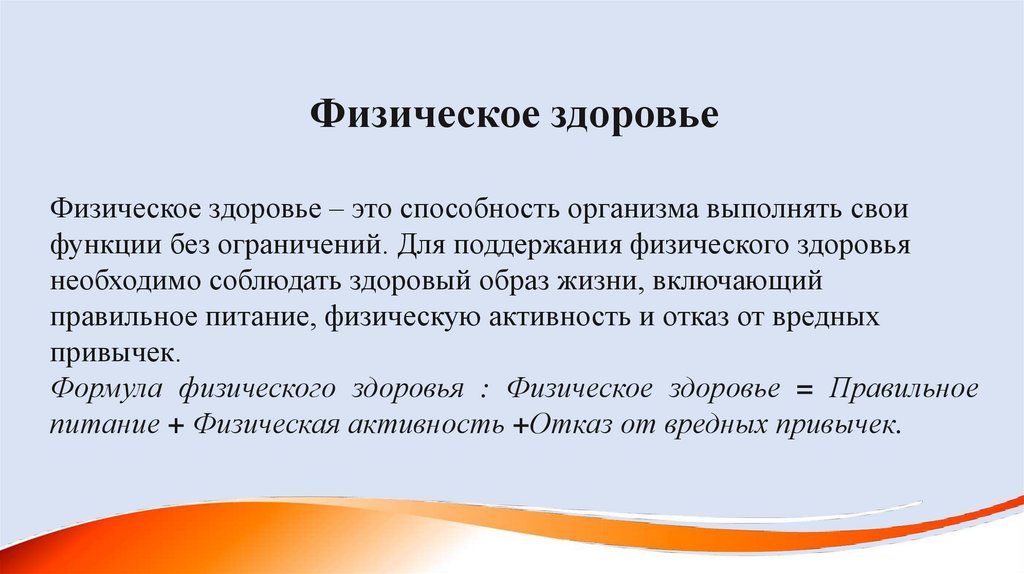 Физическое здоровьеФизическое здоровье – это способность организма выполнять свои