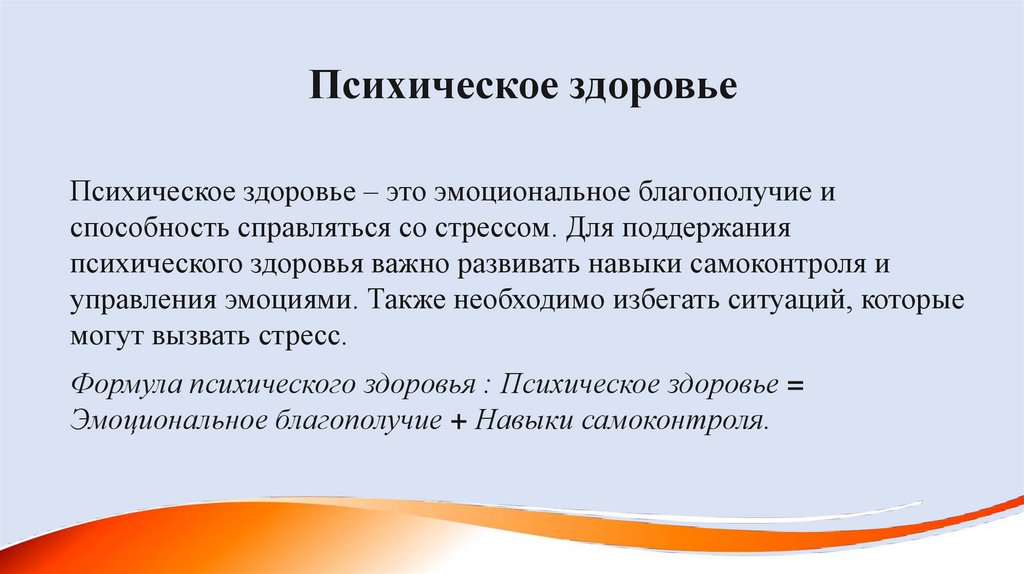 Психическое здоровьеПсихическое здоровье – это эмоциональное благополучие и