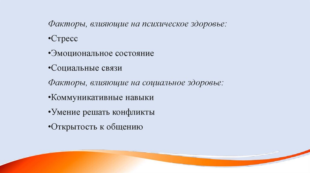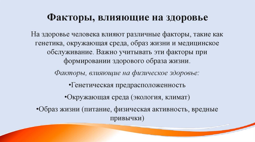 Факторы, влияющие на здоровьеНа здоровье человека влияют различные факторы, такие как
