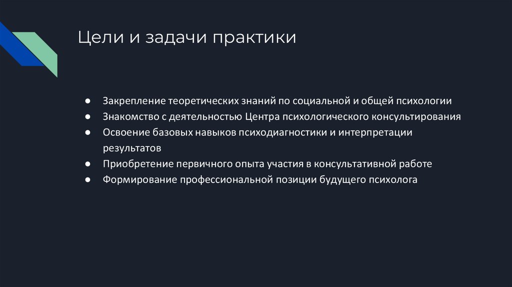 Цели и задачи практикиЗакрепление теоретических знаний по социальной и общей психологии
