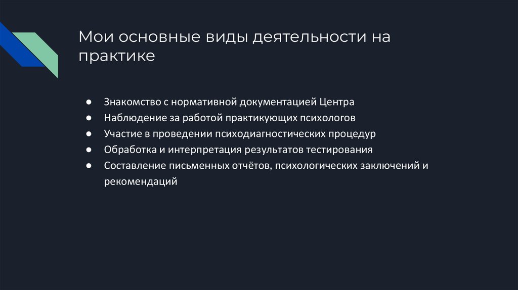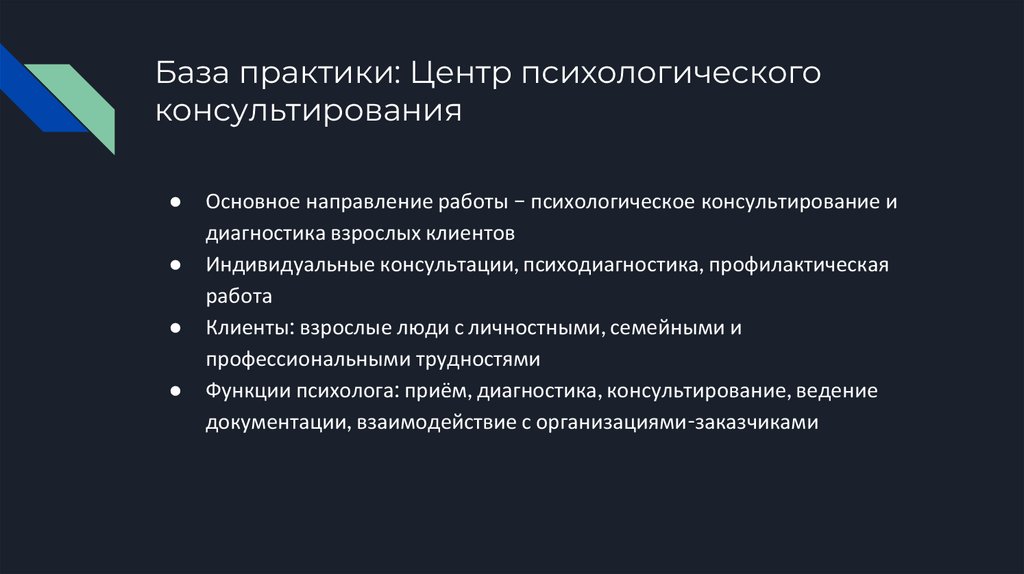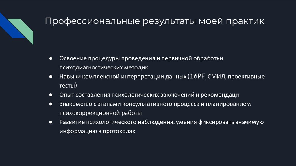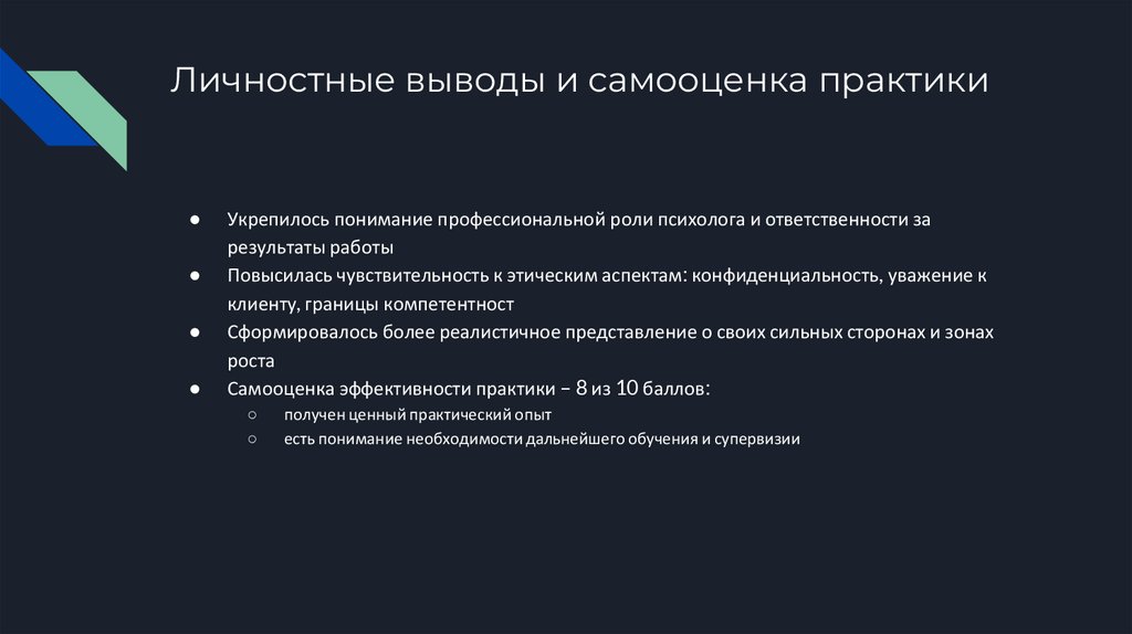 Личностные выводы и самооценка практикиУкрепилось понимание профессиональной роли психолога и ответственности за