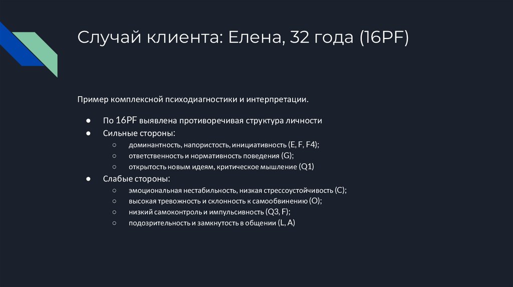 Случай клиента: Елена, 32 года (16PF)Пример комплексной психодиагностики и интерпретации.