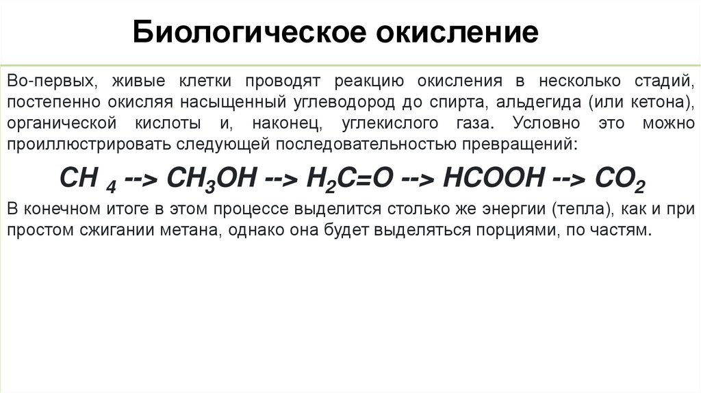 Биологическое окислениеВо-первых, живые клетки проводят реакцию окисления в несколько стадий,