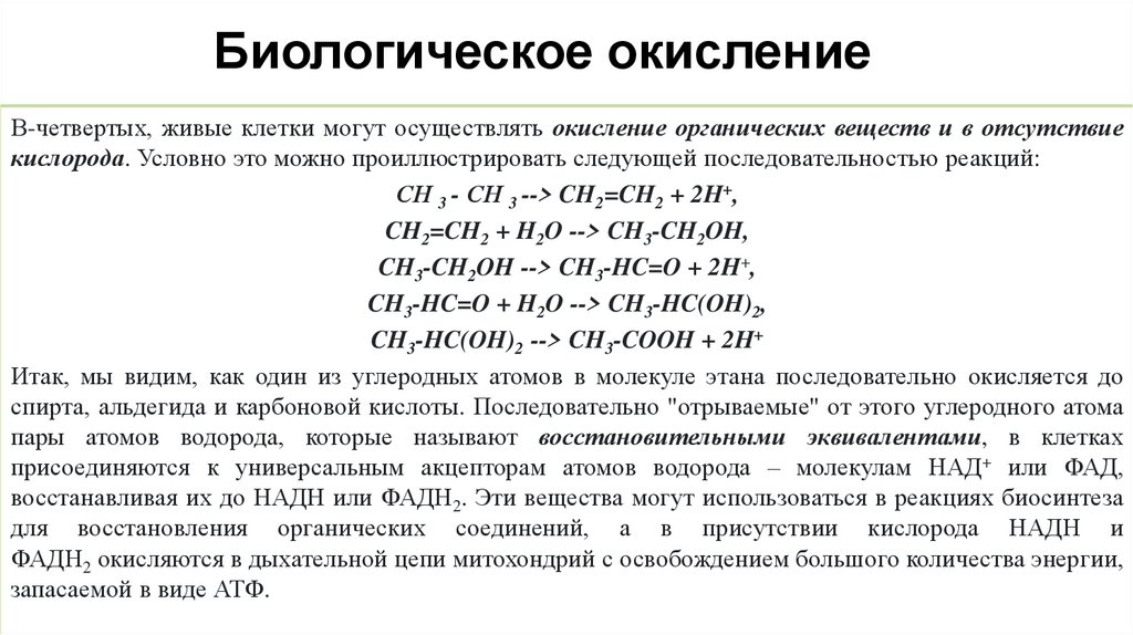 Биологическое окислениеВ-четвертых, живые клетки могут осуществлять окисление органических веществ и в отсутствие