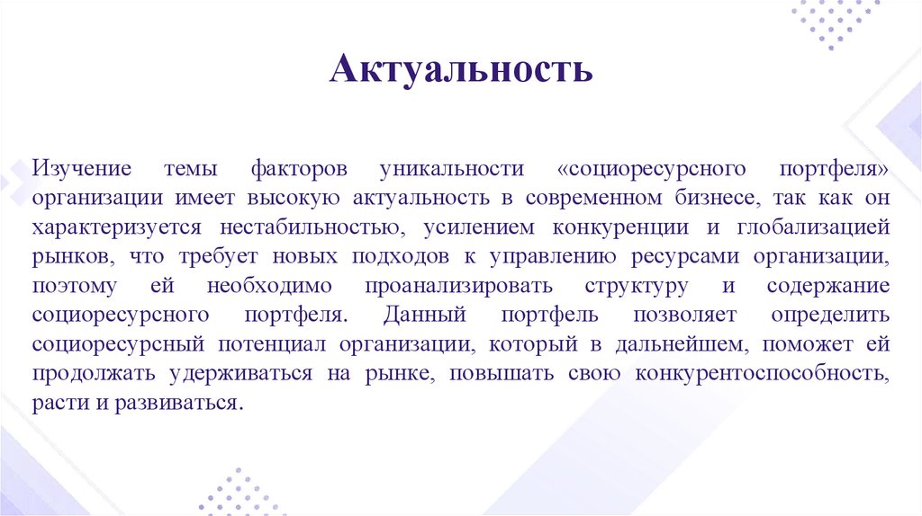 АктуальностьИзучение темы факторов уникальности «социоресурсного портфеля»