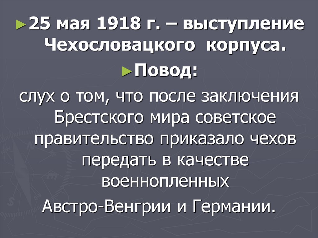 ►25 мая 1918 г. – выступлениеЧехословацкого корпуса.