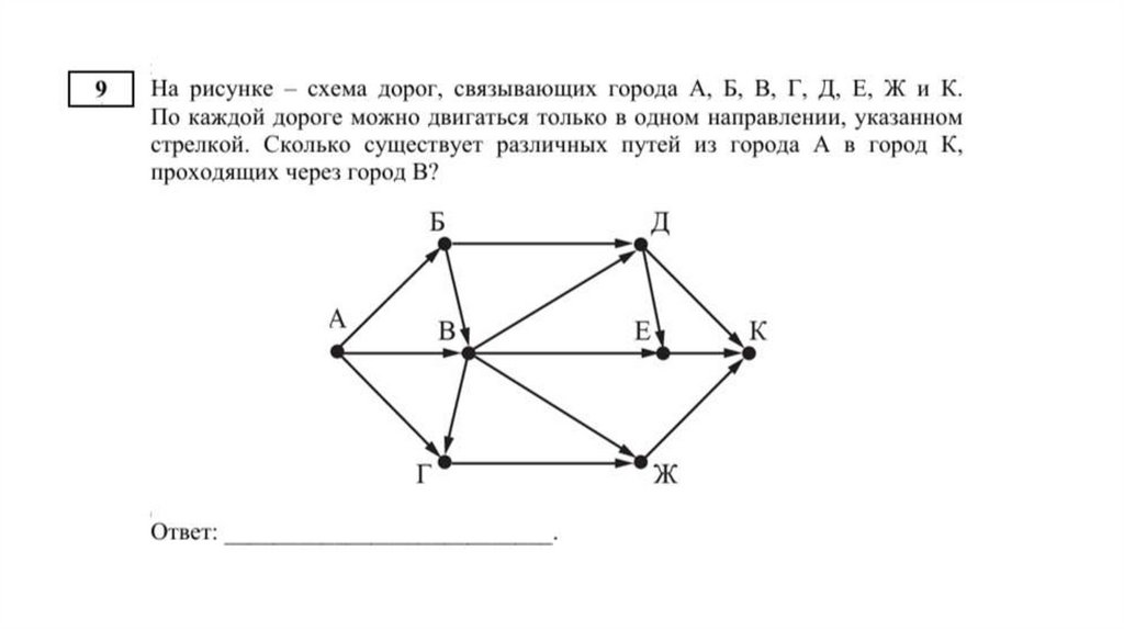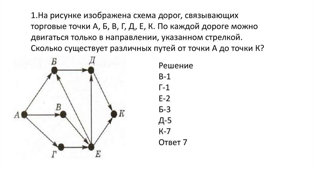 1.На рисунке изображена схема дорог, связывающихторговые точки А, Б, В, Г, Д, Е, К. По каждой дороге можно