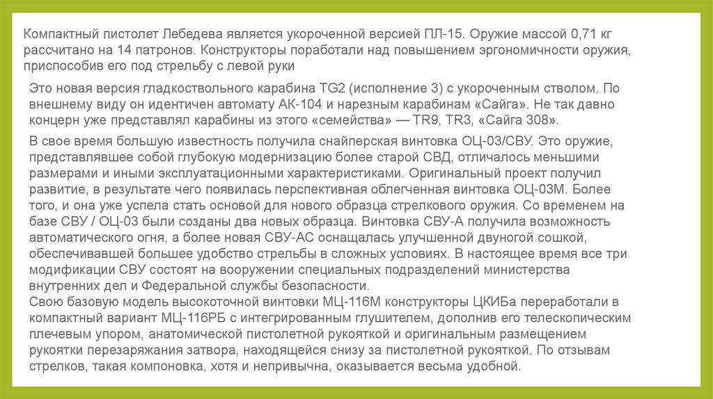 Компактный пистолет Лебедева является укороченной версией ПЛ-15. Оружие массой 0,71 кграссчитано на 14 патронов. Конструкторы поработали над повышением эргономичности оружия,