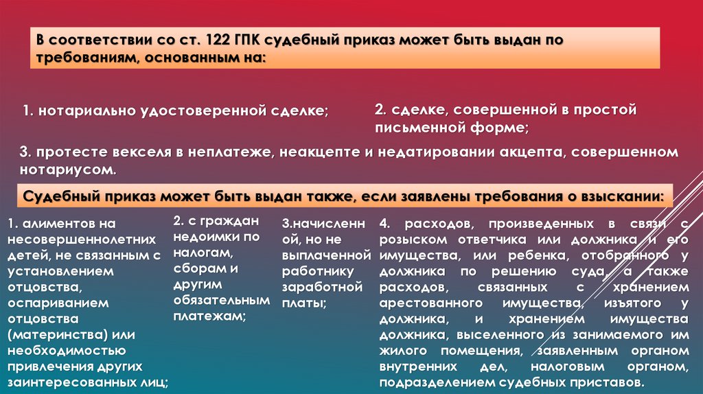 В соответствии со ст. 122 ГПК судебный приказ может быть выдан потребованиям, основанным на: