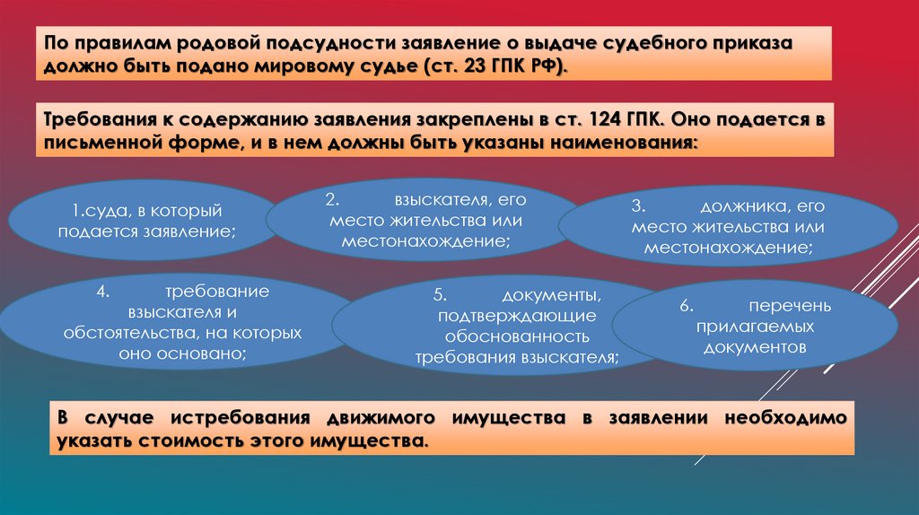 Требования к содержанию заявления закреплены в ст. 124 ГПК. Оно подается в
