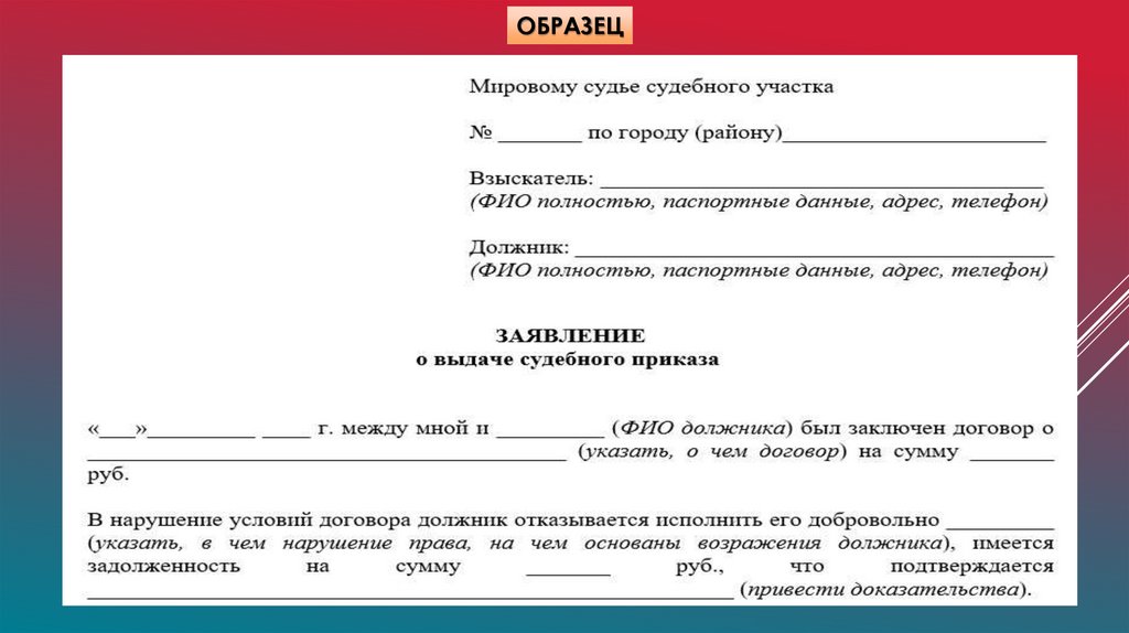 По правилам родовой подсудности заявление о выдаче судебного приказадолжно быть подано мировому судье (ст. 23 ГПК РФ).