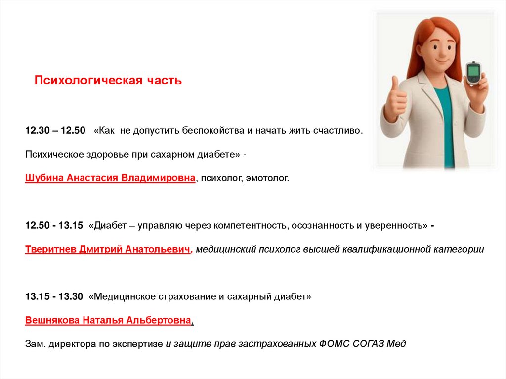 12.50 - 13.15 «Диабет – управляю через компетентность, осознанность и уверенность» Тверитнев Дмитрий Анатольевич, медицинский психолог высшей квалификационной категории