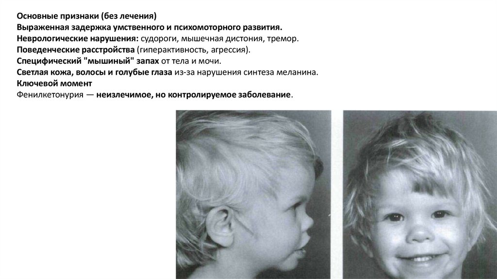Основные признаки (без лечения)Выраженная задержка умственного и психомоторного развития.