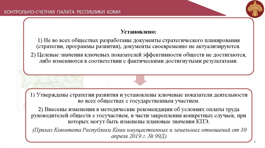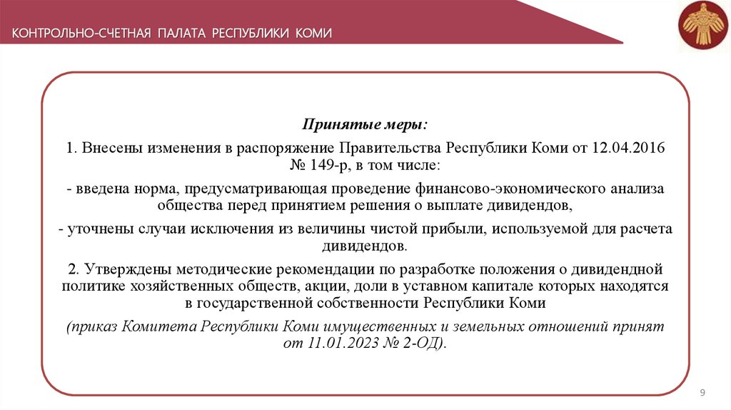 КОНТРОЛЬНО-СЧЕТНАЯ ПАЛАТА РЕСПУБЛИКИ КОМИПринятые меры:
