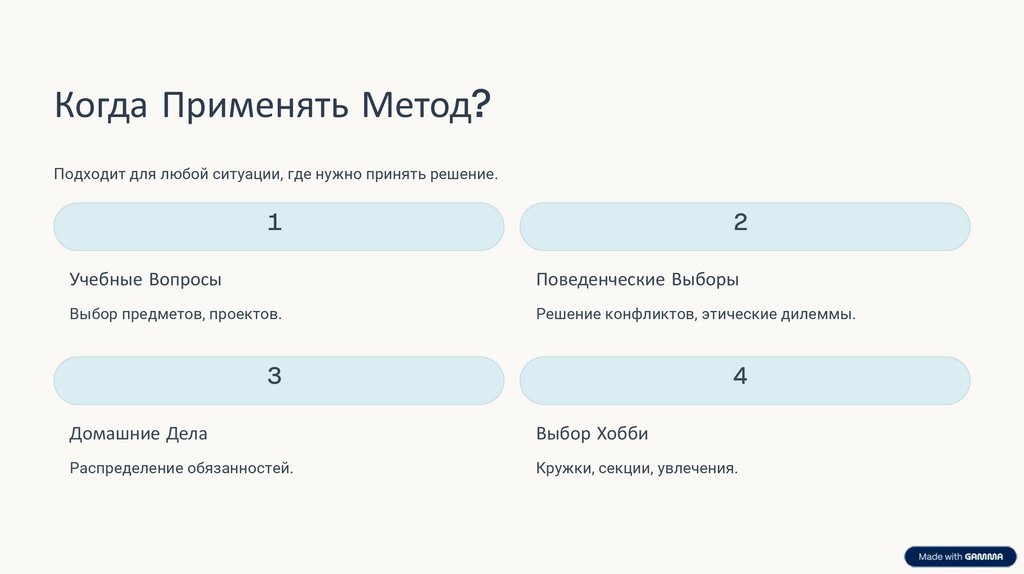 Когда Применять Метод?Подходит для любой ситуации, где нужно принять решение.