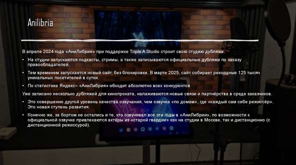 AnilibriaВ апреле 2024 года «АниЛибрия» при поддержке Triple A Studio строит свою студию дубляжа.