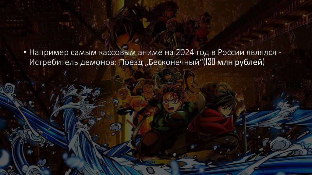 • Например самым кассовым аниме на 2024 год в России являлся Истребитель демонов: Поезд „Бесконечный“(130 млн рублей)11. Hinode 2025