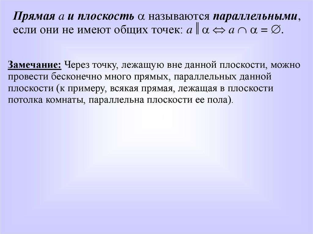 Прямая a и плоскость называются параллельными,если они не имеют общих точек: a a = .