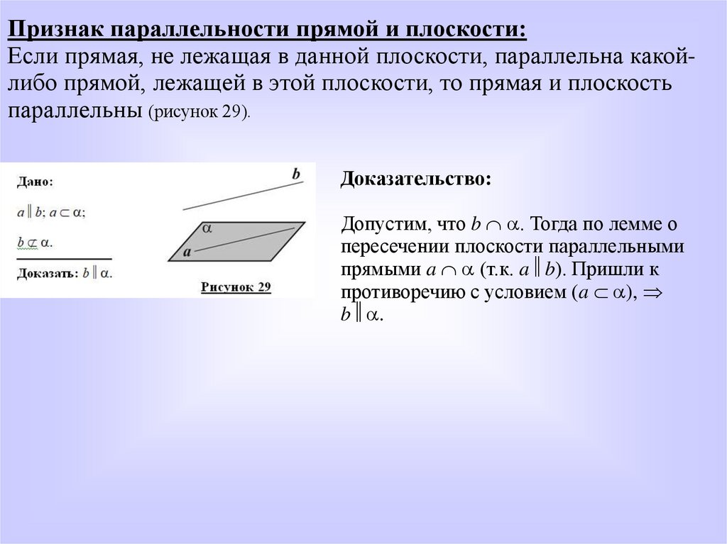 Признак параллельности прямой и плоскости:Если прямая, не лежащая в данной плоскости, параллельна какойлибо прямой, лежащей в этой плоскости, то прямая и плоскость