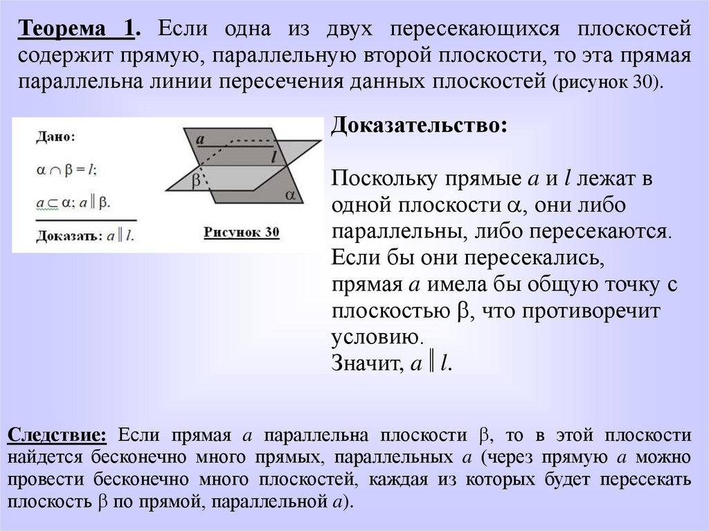 Теорема 1. Если одна из двух пересекающихся плоскостейсодержит прямую, параллельную второй плоскости, то эта прямая