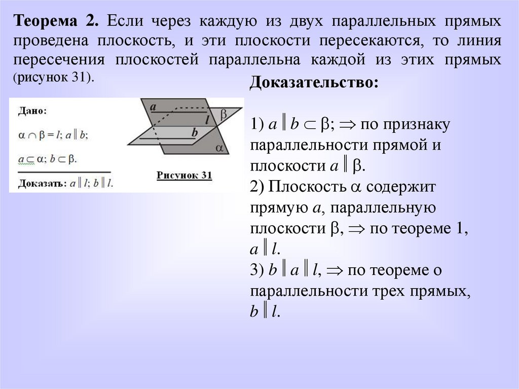 Теорема 2. Если через каждую из двух параллельных прямыхпроведена плоскость, и эти плоскости пересекаются, то линия